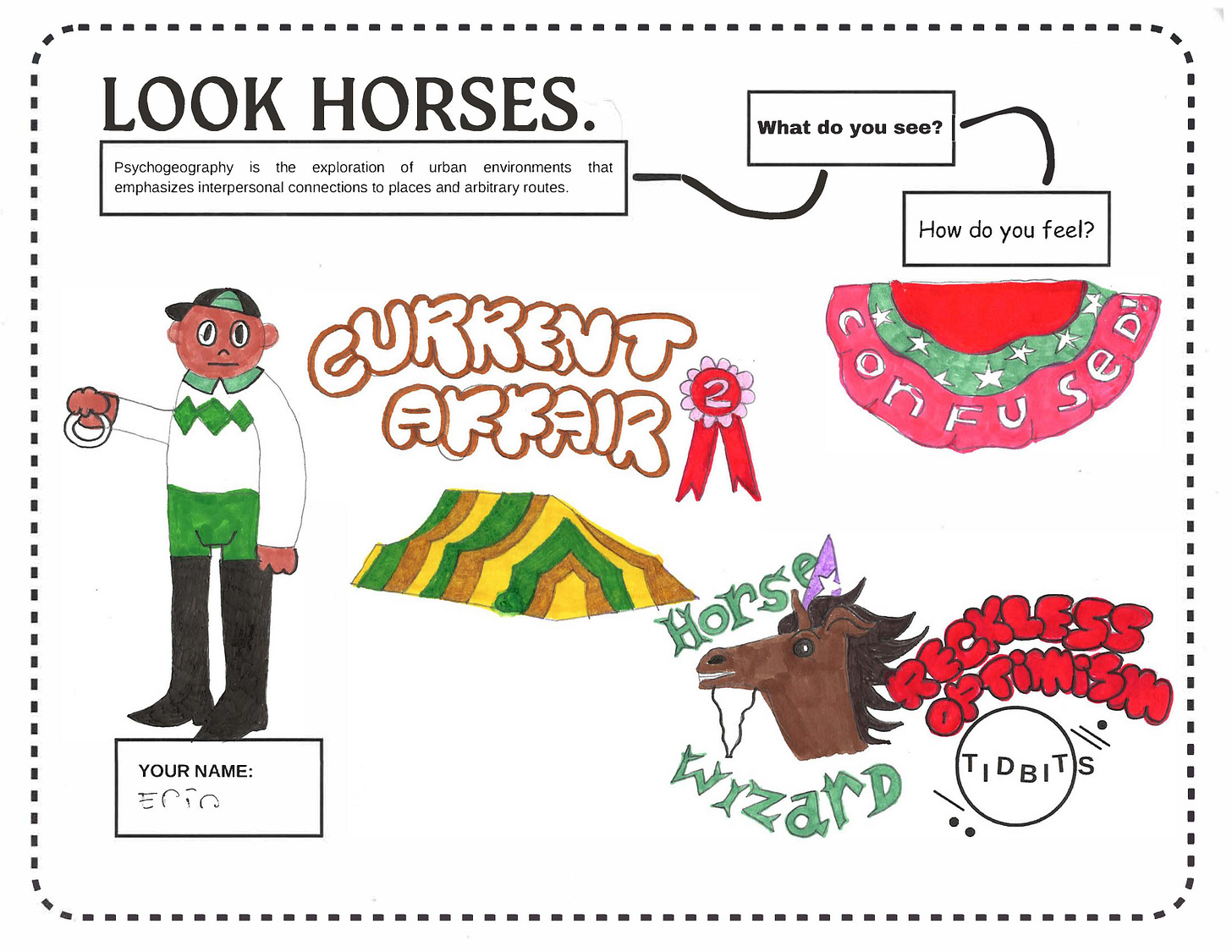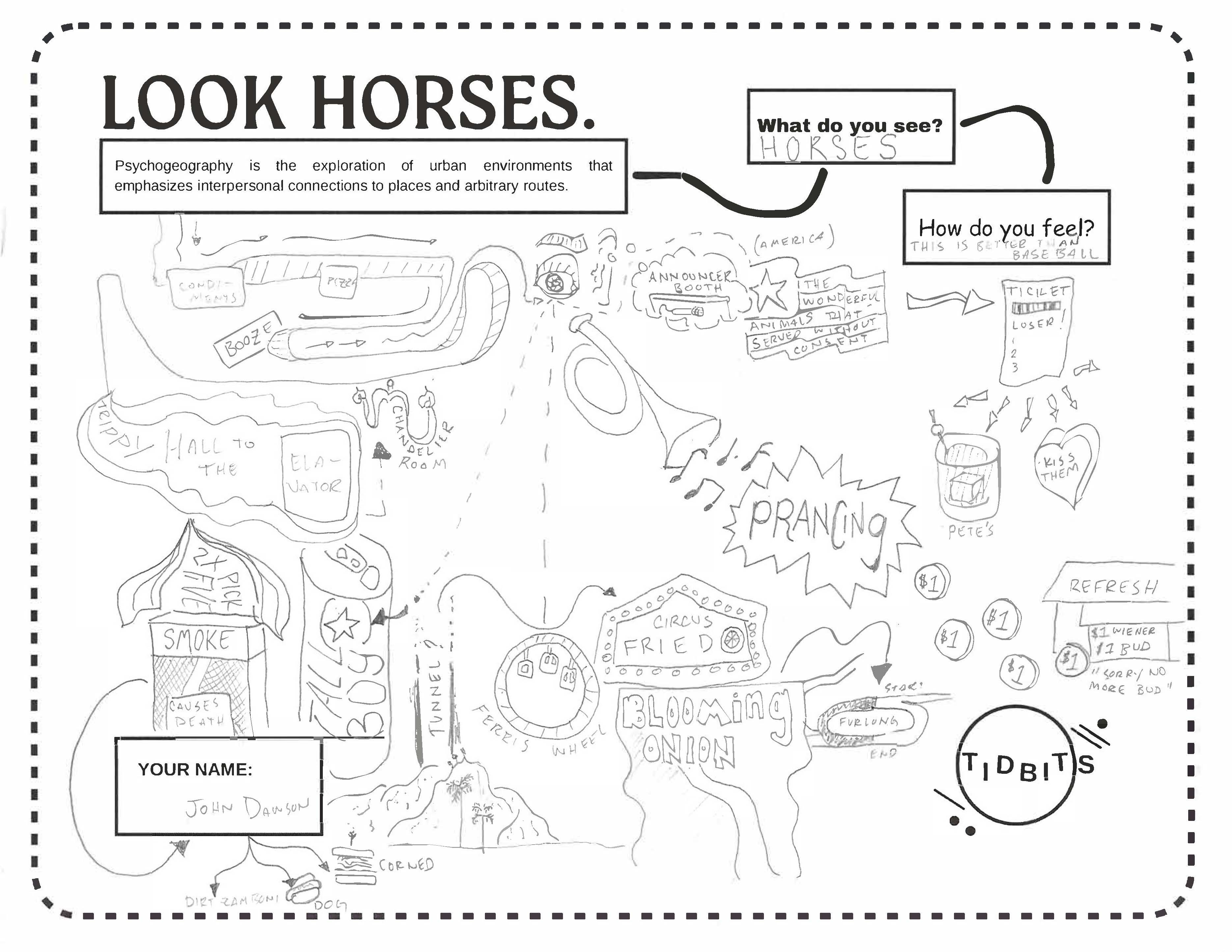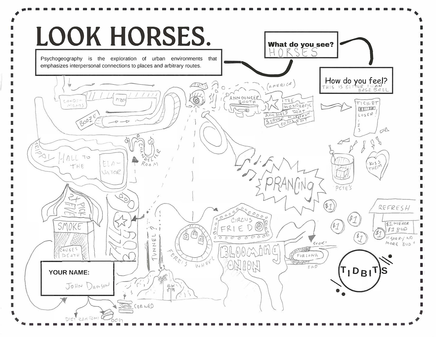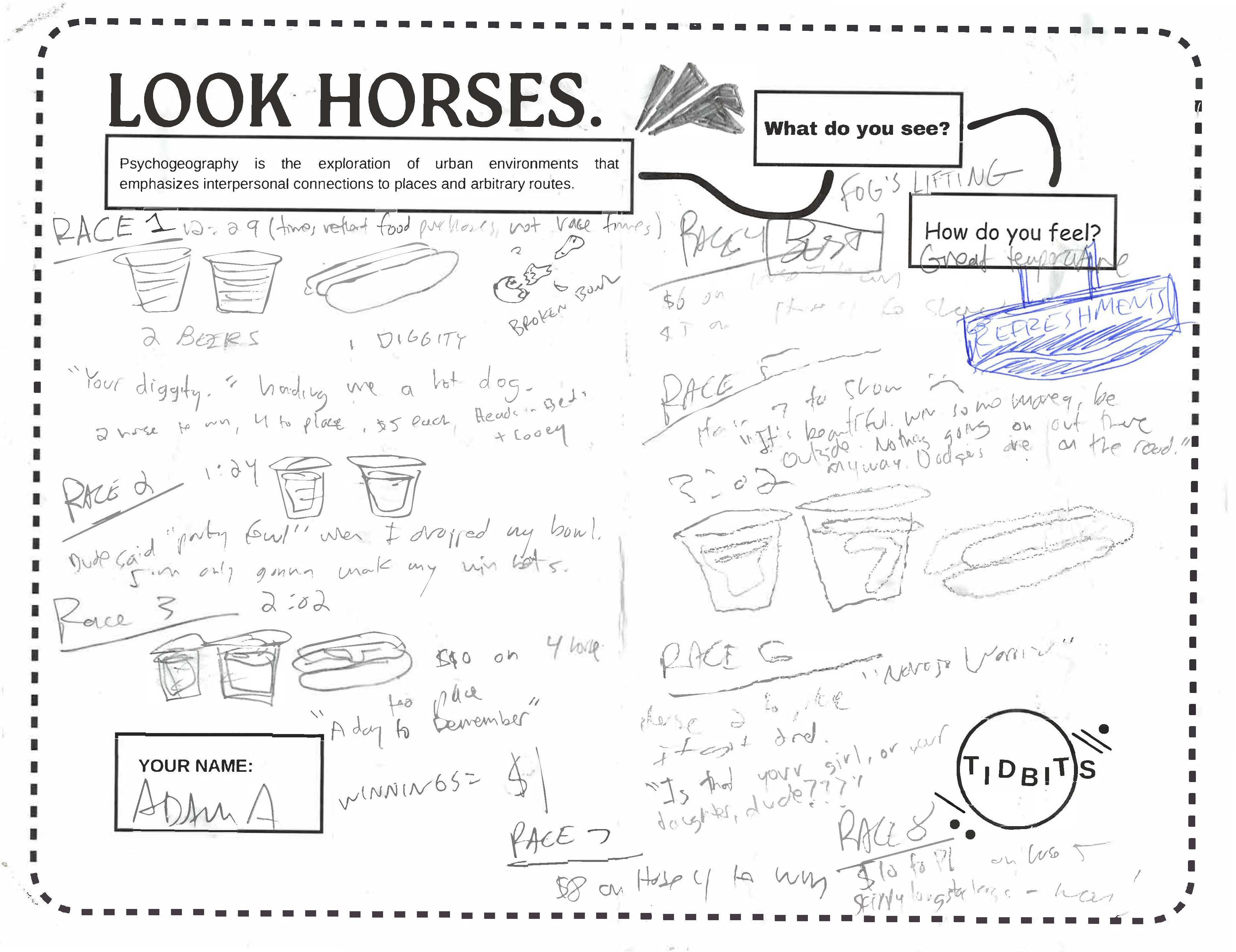We went to Santa Anita Park on Memorial Day with a small group of friends. It was Dollar Day, with cheap beer and hot dogs. We asked them to map their experience of the park—their psychogeography of the track. You can feel them below.