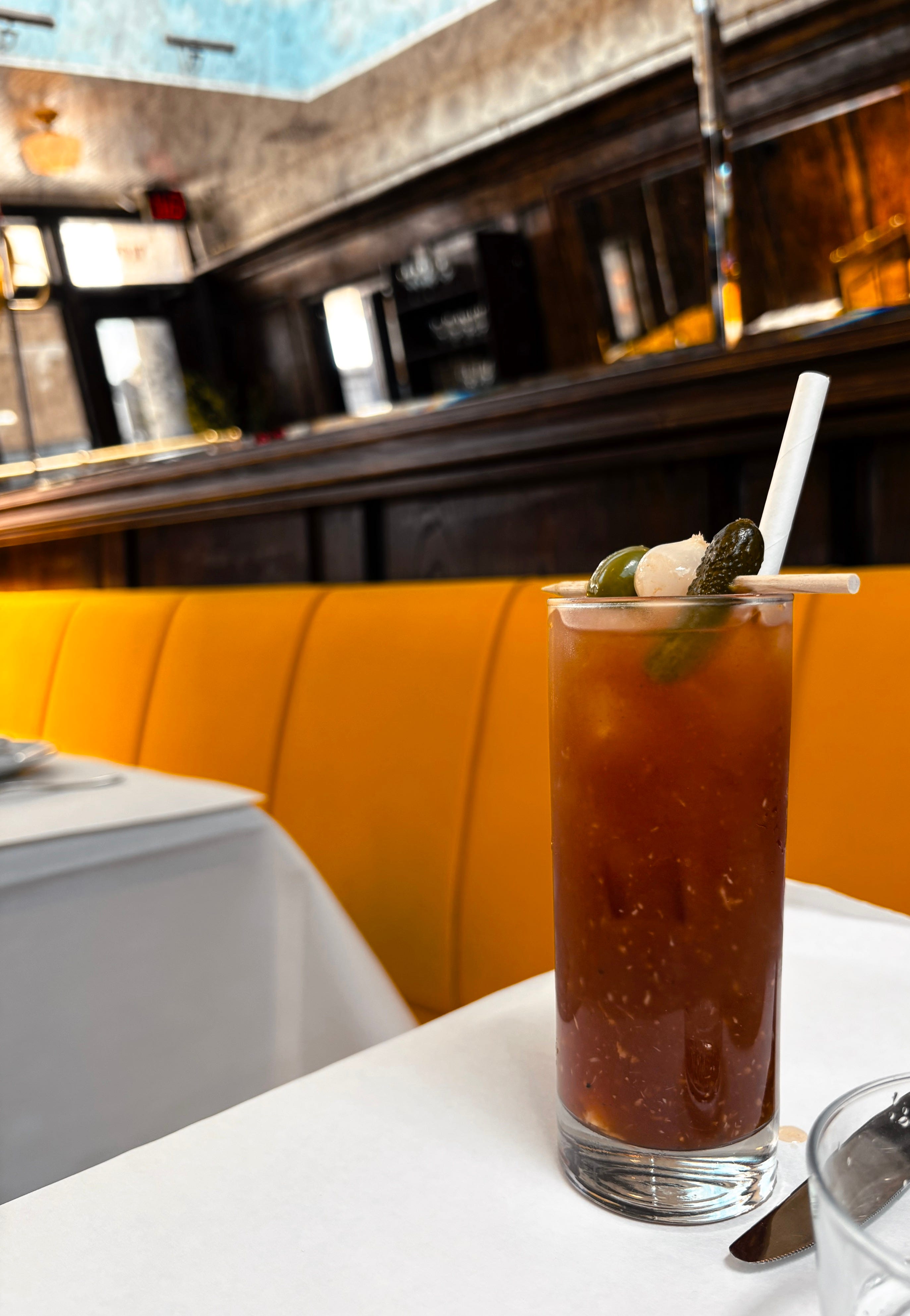 The waiter sat me at a little two-top in the middle of the dining room with a yellow booth along the wall. My first order of business was a Bloody Mary. Days like today, you need something with a kick, a drink more horseradish than anything. I could have sustained on the gherkin, pickled onion, and olive garnish, but the waiter was sweet in a studied way, like he might talk if I sat here long enough.