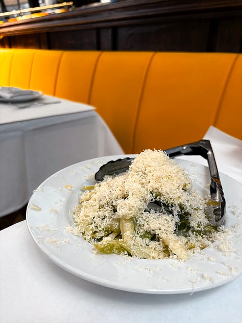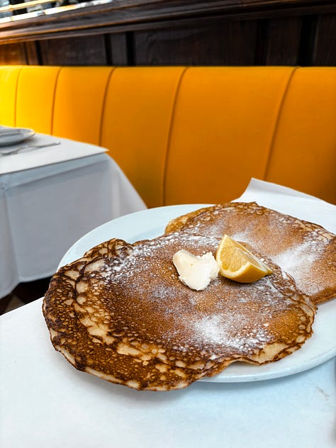 The pancakes are thin enough to bend but not break, topped with finely granulated sugar and served with a lemon wedge, butter so rich it may as well be mascarpone, and maple syrup. It’s as close to heaven as you can get in this weather.