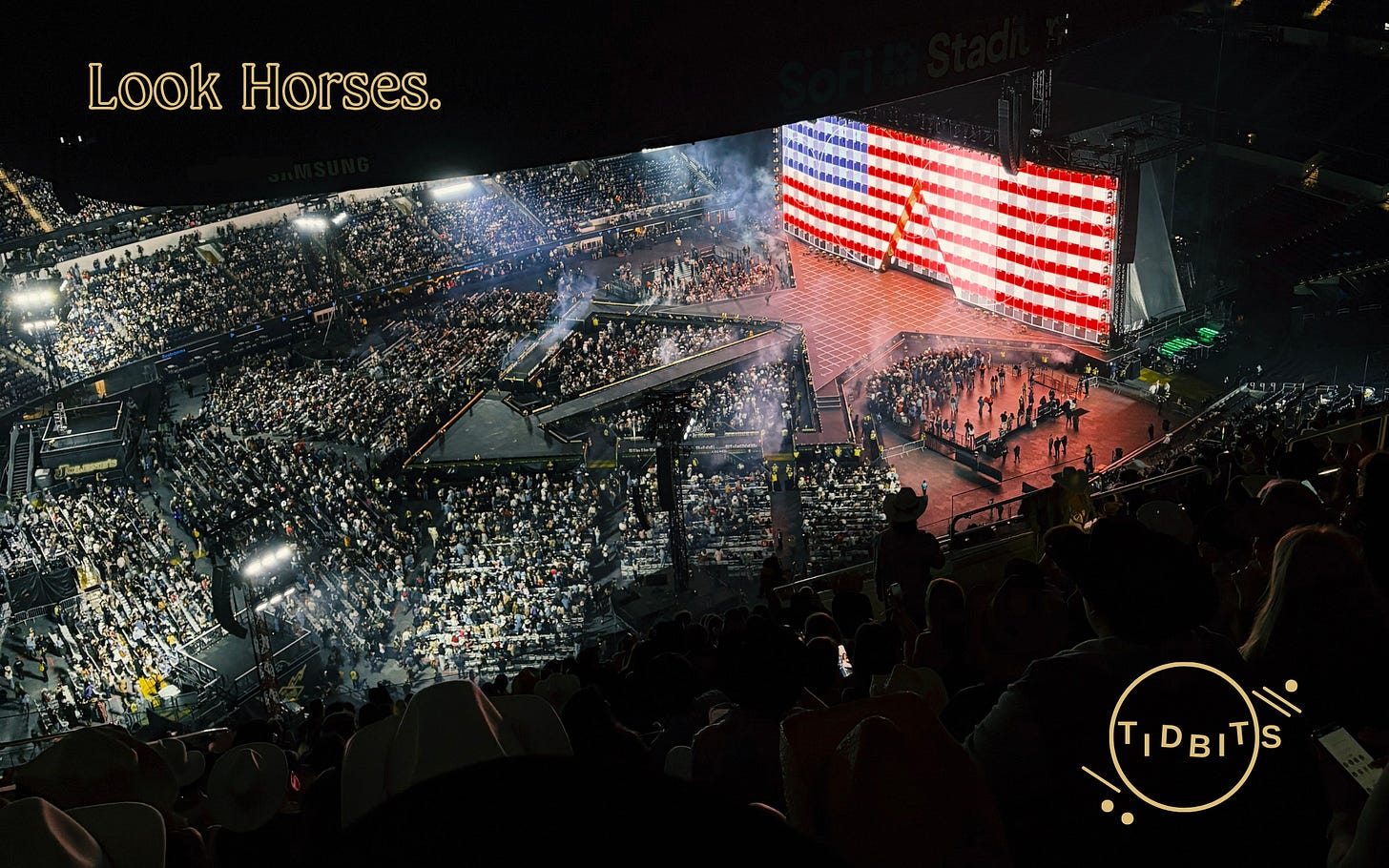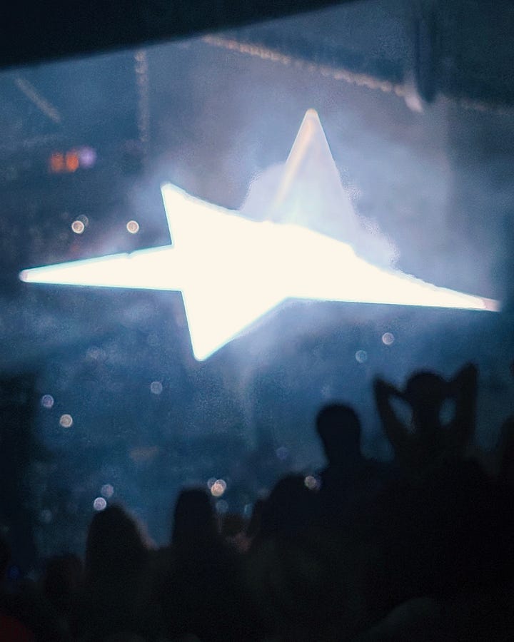 The building is empty in its bones but filled with light, bright bursts from the syncopated bracelets given out at entry. With the sheer thrill of so many enthralled, decked out in denim, white leather, snakeskin boots, rhinestones, chaps, and tasseled hats—their cowboy best—to celebrate the night. The stadium is full, and finally feels alive with a devotion and pageantry rivaled only by the recent papal conclave.